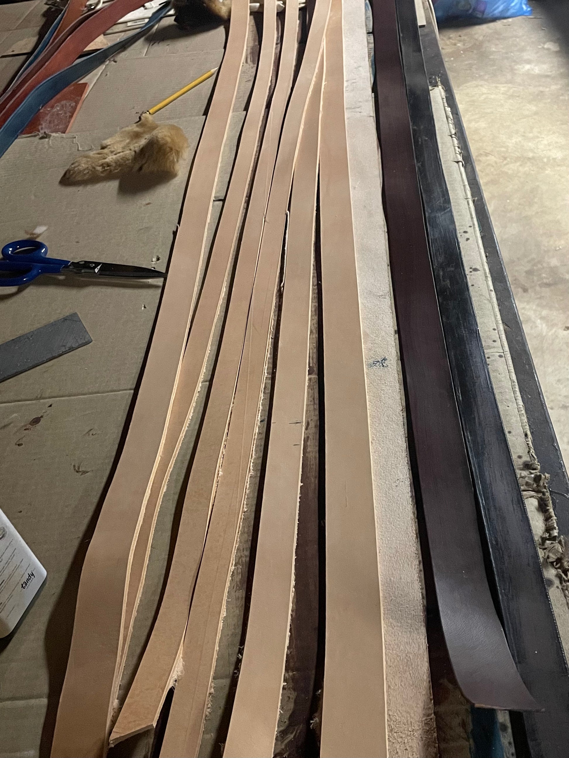 These belts are made from Veg Tan leather. They are hand cut and dyed and we also put rivets on the belts as well . To measure your size, place your existing belt on a flat surface and use a measuring tape from the tip of the buckle to the hole you are most comfortable with. If you have any additional questions regarding sizing or colors, contact us at any time.